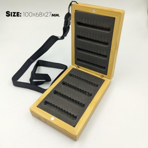 Ця коробочка виготовлена з бамбуку, має магнітну застібку щоб утримувати її закритою та шнурком для зручного користування. Багато відділень для утримання ваших мушок.