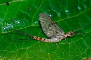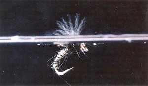 Під’їжджаючи до річки ми побачили, що по всьому мілководдю активно харчувався харіус. Він щось збирав з поверхні, а окремі невеликі екземпляри навіть вискакували з води, намагаючись схопити літаючих комах. Я спустився до води і спробував визначити, чим же харчується риба. Над водою кружляли маленькі сіро-оливкові поденки і саме за ними харіус вистрибував з води. Сідати на воду, щоб відкласти яйця, ці комахи будуть набагато пізніше, вже в сутінках. Значить, зараз харіус підбирав з поверхні води щось інше. Я побачив як за течією пливе щось з темними крилами. Їх було багато.