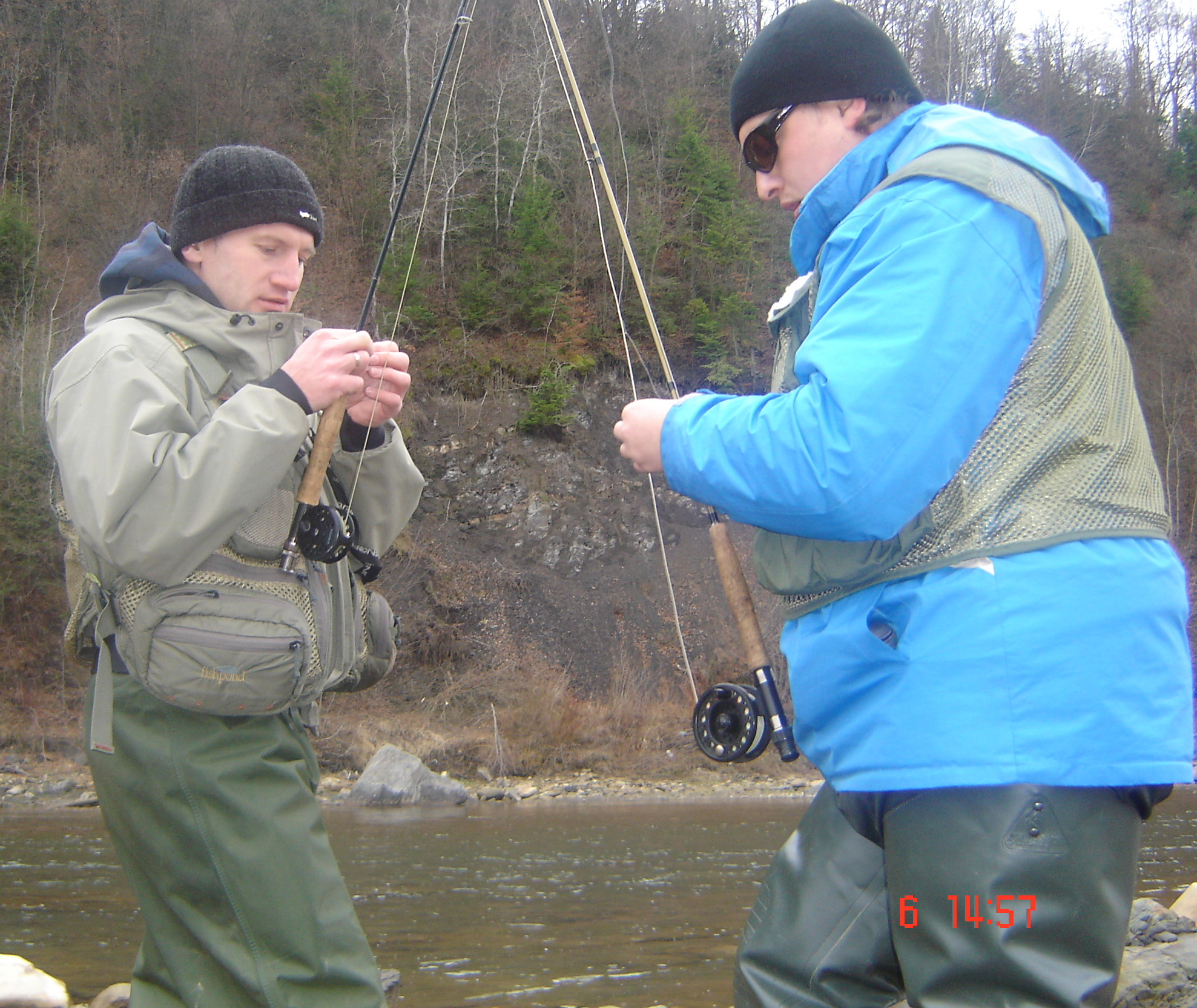 Ми переходимо річку і йдемо до першого перекату. Місце вже зайняте – тутешній рибалка закидає на течію хробака. «Я вже годину ловлю – жодної риби. А в середу тут таки зловили пструга на 600 грам. Правда, на сітку» – ділиться рибак місцевими новинами. В принципі, його нарікання на відсутність активності риби нас не здивували. Очікувати жор харіуса в 10-ій ранку не варто. Тим не менше, ми розклалися і почали. За кілька хвилин перший клієнт таки спокусився на Андрієву муху. А ще трохи згодом, більший харіус взяв на сусідньому перекаті. Рано ще – риба не відійшла від заморозків. Я міняю оснастку і ставлю дві німфи. Проводки все-одно результату не дають. Ми йдемо вниз по течії, зупиняємося на перспективних місцях. На одному з таких перекатів Андрій щось кричав з протилежного берега, але шум вітру не дозволив його зрозуміти. Я розвернувся до нього, а німфи тим часом скотилися з поля зору і зависли в течії. Поки ми перегукувалися минуло кілька секунд. У цю ж мить відчув, що хтось вириває з рук мою вудку. Механічно підняв її вгору – на невагому муху спокусився пристойний екземпляр, але розгледіти його не вдалося. Від несподіванки я не встиг вхопити шнур, який дав слабину – риба махнула на прощання хвостом і щезла у воді…
