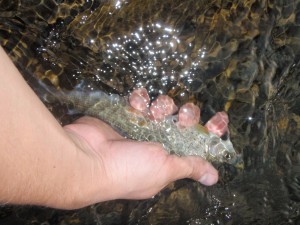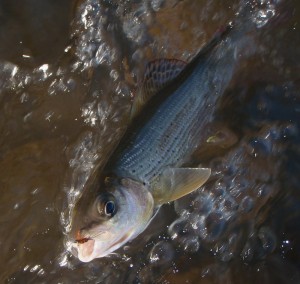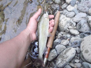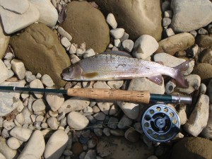 Попереду відкрилася заманлива картина. Перекат знаходився біля протилежного берега. Туди я пішов один, а Діма відправився підкорювати мілини трохи далі. Майже 10 хвилин я безрезультатно посилав мушку по течії. Врешті-решт дійшов до думки, що тут харіуса нема. Закинув вудку на плече я вже повернувся щоб іти далі. Але зненацька відчув удар і побачив, що рибина вхопила мушку, яка тягнулася проти течії. Отже, харіус тут є. Неймовірно. Та сама мушка, те саме місце, але тепер харіус ніби прокинувся – ледь не кожна проводка закінчується стрибком риби, яка по-дельфінячому кидається на муху зверху. Просто фантастика! За наступні півгодини мені вдалося упіймати шістьох пружних красенів, і приблизно стільки ж бистрянок. І знову тиша…
