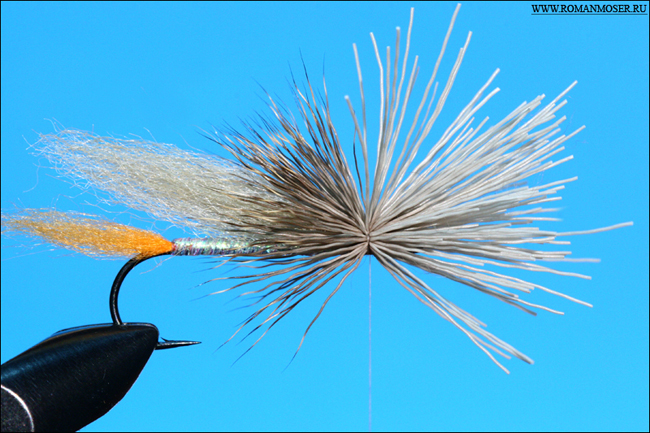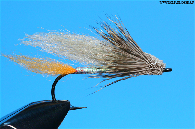 Д. Деякі мухарі навмисно просочують головку лаком, нібито для її міцності, але при цьому втрачається весь сенс застосування хутра в головці. Перед початком ловлі головку мушки треба просочити водою, для цього опускаємо мушку під воду і відтискаємо головку приблизно так, як і губку. При цьому порожнини волосків хутра (хутро оленів всередині пористе, помилково раніше вважали, що воно схоже на макаронину, але це не зовсім так – воно складається з суцільних ділянок та ділянок заповнених повітрям) просочаться водою і стрімер, по-перше, буде відразу після закидання тонути (це дуже важливо при лові в обмежених за розміром відкритої води місцях), а по-друге більш стабільно рухатися у воді.