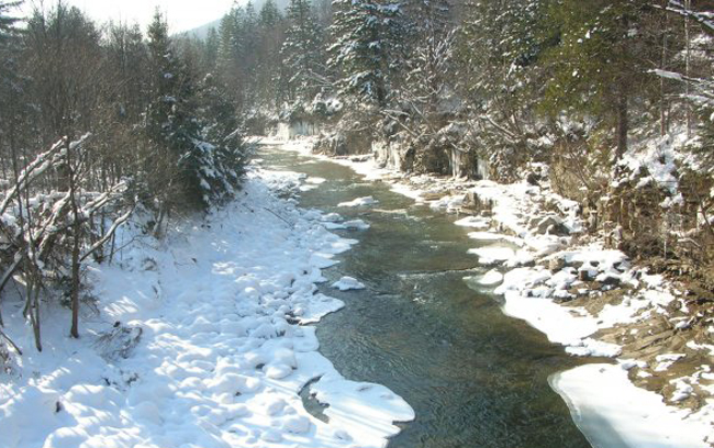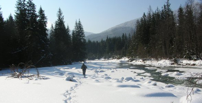 Південний вітер. Залишки брудного снігу. Скована армада свинцевих хмаринок з рідкісними проміжками кольору пудри дитячого харчування пропадає в жадібній свердловині горизонту. Невидима діра вбирає і поглинає брили алейронової матерії, насиченою і готової обвалити кристалізовані легіони крапель води на харіусові береги. У повітрі витає тінь скандалу – в тіні не менше плюс шести, пахне рибою. Інверсійна атака висхідних потоків повітря і проктологічна нудьга нахлистовика зіткнулися – чекай біди.…Дивуюся власній зухвалості. Порпаюся в рюкзаку. Мужньо стримую спопеляючі погляди домашніх, які давно заспокоєні і в душі переконані: нахлистовий сезон, як такий, зник з останнім вербовим листом і клятвенним словом. Не чекаючи такого підступу, рідні мило усміхалися і поблажливо поглядали на кумедне в’язання мух. Аж тут тривога! Порушник конвенції і на додачу злісний сепаратист грішить не тільки в’язанням, але і збирається на рибалку! Треба ж, і ще має сміливість стверджувати: з першими заморозками відкривається процес речовинного втілення нахлистового бажання і мистецтва лову харіуса. У містких нутрощах рюкзака разом з фотоапаратом і неопреновими штанами зникає жилет, куртка, рукавички і, на всяк випадок, пляшка пива, в супроводі пишного бутерброда з печінковим паштетом. Залишився вільний закуток для термоса, заодно там вмістилася дволітровий бутель мінеральної води. Навіщо стільки рідини? Знаємо службу, хлопці, прощайте рідні, там буде непросто і жарко…Дружина, немов медсестра лазарету, згнітивши серце і пускаючи сльозу, доглядає за безнадійно хворим з надією на чудо домашнього затишку і механічно підливає кави. Син, відірваний від віртуального світу, байдуже спостерігає: «Так, на твоїй могилці не будуть ридати діти і не буде заповітного: « Татусю, татусю, ти нас чуєш?»… Теща, як рідна, скорботним поглядом стежить за рухами дочки і чомусь починає розповідати про якогось далекого родича, який програв у карти маєток. Потім він пішов в запій і, крім всього іншого, зник на рибалці. Придавлений атмосферою, відчуваю, що природа погано мене виліпила, але на провокації не піддаюся і методично, не озираючись, завантажуюся в дорогу. Приводом до відвідування харіусової річки взимку стало аж ніяк не прогулянковий настрій з гострим бажанням споглядати історичні місця літньої «бойової слави» чи навіть не підла думка втекти від сім’ї і дітей. Виною всьому – температура повітря. Що в останні роки діється з погодою – у вищій мірі сурйозно. Факт: при тенденції до зростання температур і в силу природного протидії скоро перейдемо до вирощування коропа на споконвічно лососевих нерестовищах або почнемо коливатися між двома началами – садити далі картопельку або почати прищеплювати культуру ананаса… Немає слів, турбує це: розростання озонових дір, танення льодовиків, – і іноді жах як страшно – струси земної кори в сусідній Мексиці. Як говорив великий Гюго: «Упертість розуму – це дурість, поєднана з тупістю, і служить її доповненням»…Продовжити сезон, незважаючи на значні втрати у стосунках з близькими. Заради чого? Ну, не був француз дружний з нахлистом, це точно… Не знав і не здогадувався, що є на цьому світі числення іншого порядку, з тихим щастям на зимовій річці, в обнімочку з оманливо заснулою природою, прихованими рибами і фантастичним