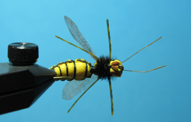 Мушки з винесеним тілом більш мобільні, ніж цільні. Деякі в’язальники насаджують готове «піночне» черевце на цівку вигнутого гачка типу Grub і фіксують краплею клею або монтажною ниткою. Більш реалістичних результатів можна домогтися намотуванням тонкої і вузької смужки (ширина46 мм, товщина 1-2 мм) «пінки» на цівку гачка. «Пінка» береться жовта, а чорна сегментація створюється або за рахунок забарвлення одного з її країв чорним перманентним маркером (Edding, Kurecolor), або за рахунок подальшої обмотки чорною нейлоновою ниткою. У першому випадку візуальний результат помітно краще, але маркер в процесі експлуатації мушки буде змиватися, незважаючи на свою водостійкість. Можна, потренувавшись, навчитися одночасно намотувати дві дуже тонкі смужки «пінки» – чорну і жовту одну поверх іншої. Якщо вийде, то результат може виявитися вражаючим. Пінка для намотування готується наступним чином: для гачка № 10-12 береться смужка шириною45 мм, товщиною 1,5-2 мм. Той кінець, з якого почнеться намотування, зрізається під гострим кутом, за цей кут пінка кріпиться на цівку гачка.