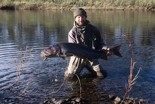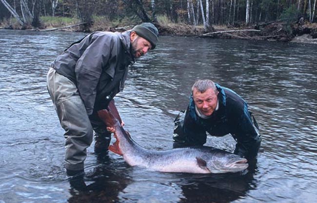 До речі, ця зустріч цілком можлива. Не вірите? У червні 2002 року на річці Їм (притока Амгуни) Олег Абрамов з Хабаровська при мені зловив на спінінг солідного тайменя довжиною 131 сантиметр (вага – близько 20 кілограмів). На правій «щоці» у риби був давно зарослий шрам у вигляді ямки. Олег усіх своїх тайменів відпускає, а як же інакше? Ось і з цим трофеєм він сфотографувався на пам’ять, і – гуляй, риба! Рівно через рік я прийшов на ту ж яму, закинув великий темний «Інтрудер» і зловив великого тайменя. Хвилин 20 боровся, а потім вивів його на косу. У місце стоянки риби берег був незручний, і довелося силою виводити її на перекат нижче за течією. А таймень ніяк не хотів покидати своє прикриття – уперто тримався в тій же ямі. Але ось трофей біля берега. Міряю довжину – 138 сантиметрів. Найбільша риба у моєму житті! А що це у нього на правій «щоці» – невже вм’ятина? Ну, точно! Це той же самий таймень, тільки підріс за рік на 7 сантиметрів, ну, і додав у вазі. Фотографую рибу і відпускаю. Рівно через рік той «мічений» таймень, що підріс на 7 сантиметрів, попався на мою муху, притому точно в тому ж місці.