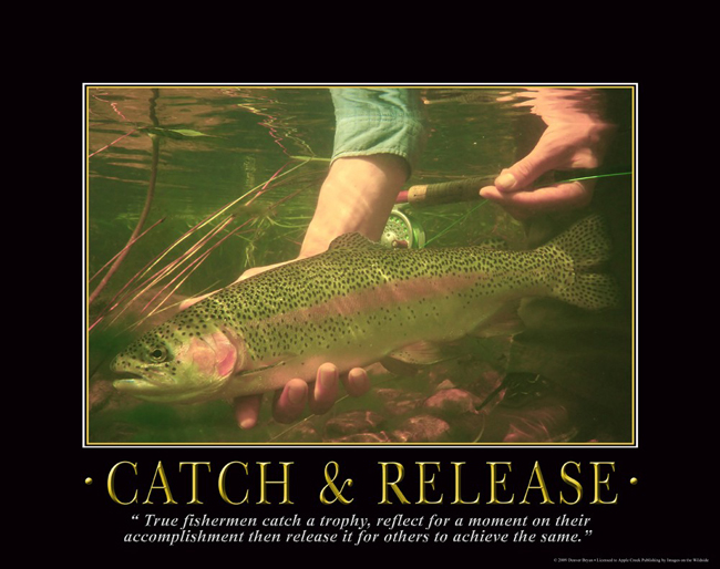 Ну, що можна на це відповісти? По-перше, у багатьох випадках навіть найпалкіші противники випускання улову змушені так робити – якщо вони не хочуть порушувати Правила рибальства. У багатьох водоймах водяться рідкісні і заборонені до вилову види риб. У разі піймання риби з цих списків Правила наказують негайно випустити її назад у водойму. Передбачається, що хоча б частина випущених риб виживе – як і відбувається в реальності.