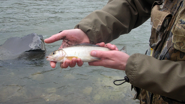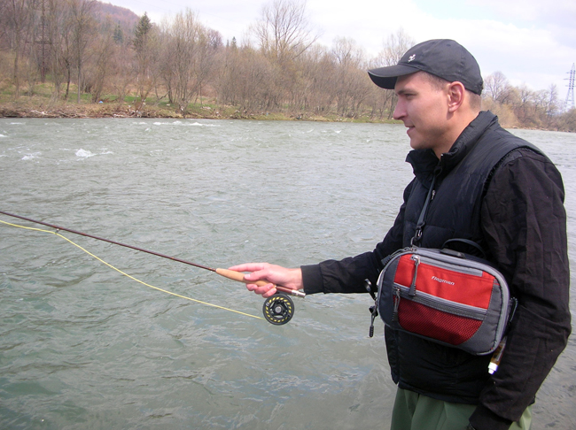 Їдемо далі, до впадіння. В останній день березня тут я впіймав трьох пирів. Розраховую хоча б на такий же показник і сьогодні. І буквально на перших же закидах витягаю першого харіуса, а за ним іще одного. Кличу Арсена і ставлю його на правильне місце, але бачу, що він відпускає занадто багато шнура.