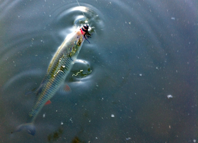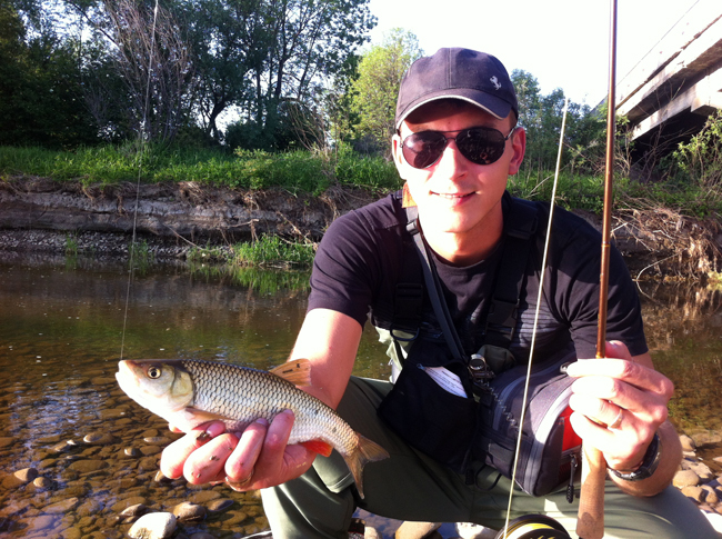 Таке враження ніби за ніч річка вимерла – сухі, мокрі, німфи, жуки – все марно. Та тільки годинник показує 9.00 вода як в казці оживає. Декілька покльовок на перевіреного жука, і я вирішую розловити симпатичних жучків, люб’язно наданих товаришем, і, о чудо, закид – невеличкий голавлик вже позує перед камерою.