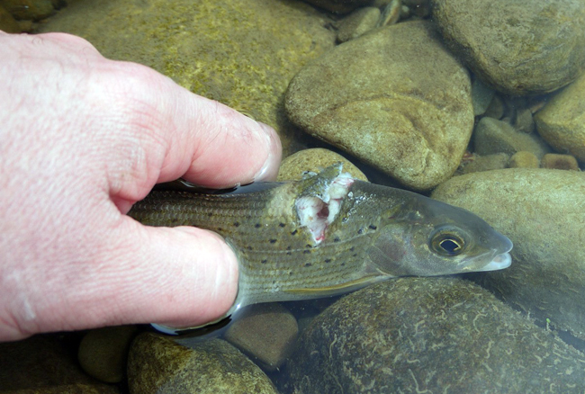 Практично одночасно з двох різних річок різних областей до мене прийшли тривожні фотографії від нахлистовиків. На одній з них, як видно, хоч і не чітко, харіуса хтось “одягнув” в пластикове кільце. Для чого це робилося мені не відомо. Можливо, у когось з вас є якісь пояснення. На двох інших фото видно, що буває з харіусом після полювання безсоромних стрільців-підводників. Ще є версія, що це справа рук тих, хто вночі б”є рибу острогою. Ці риби були спіймані на муху. Що думаєте?