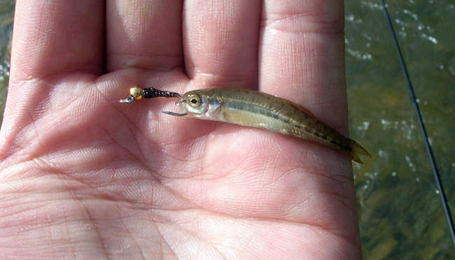 Почав я з двох бистрянок і сходу харіуса, який взяв на маленьку підвісну шоколадку. Потім було два гольяни, один удвічі більший за німфу – симпатична картина, ге?