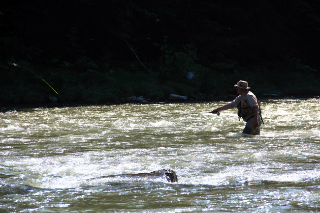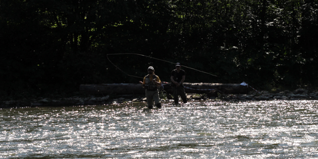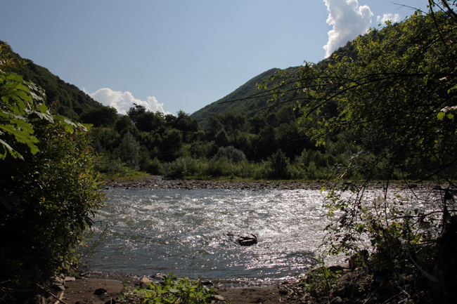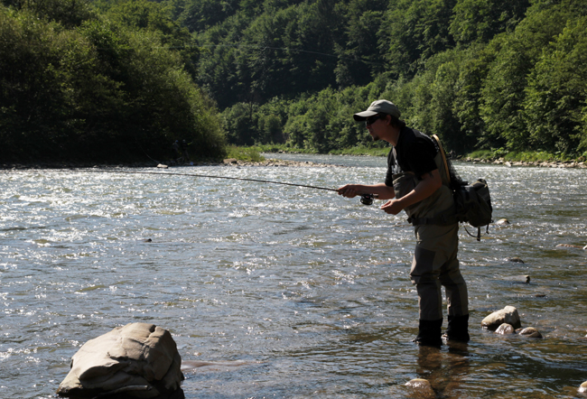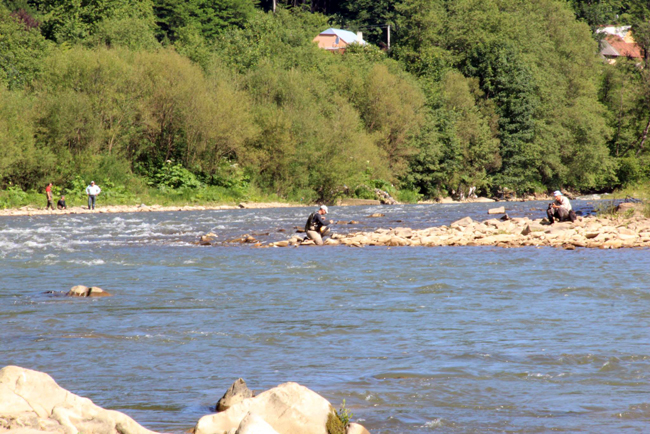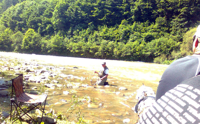 Після того, як усі учасники повитягували візитки Діми Петруняка (цього разу карт не знайшлося), ми з Ганною відправилися на перший пул. Нашим сусідом мав бути Женя Федоренко, а от що діялося далі я вже не бачив. Розкладний стілець зручно вмостився між камінням на невеличкому острівці, що розбивав Ріку на двоє. Праворуч був цікавий перекат, а ліворуч просто течія, без жодних ознак риби. Цілком закономірно, що Ганна почала обловлювати перекат усіма можливими способами.