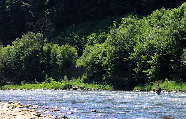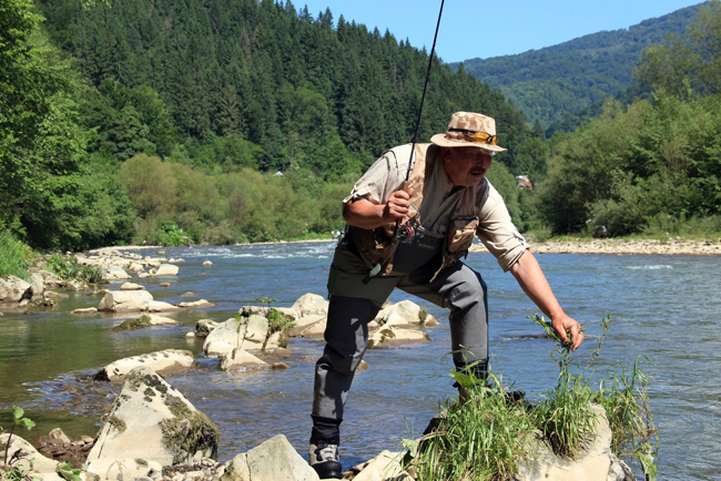 Діма закурив свою люльку на камені і лише співчутливо дивився на мене… Ми перекинулися кількома словами, після чого я почав обловлювати місця, де вода впиралася у великі каменюки. За ними течія була трохи повільнішою. За словами місцевих хлопців, харіус ніколи не сидить там, де є бистрянка. Відразу зауважу, що в наших краях це правило не працює. Але в Закарпатті, на Ріці, щось у тому є. Після кількох виходів дрібноти я відрізав від свого маршруту нехаріусові місця, поки не дійшов до найбільшого каменю в моєму пулі. Після першого ж закиду в цю зону я нарешті побачив харіуса. Він якось незграбно вийшов на муху, але чомусь її не схопив. Я на мить перевів подих – головне, що він не вколовся. Повторний закид – харіус знову виходить, але цього разу відверто промахується – мушку в останню мить зносить вода. Ну, все, думаю – пропало. Третій раз він точно не вийде. Але на удачу я все ж закинув сухарика і харіус таки взяв! З криками я підвів його до себе, ледь висмикнув підсак з-під дощовика і акуратно завів рибину у сітку. «Можеш не йти до мене, я бачу, що то харіус» – засміявся Діма. Риба поплила, а Ріка почула моє «юхуууу!». Головне, що я втік від нуля, хоч усе до цього йшло.