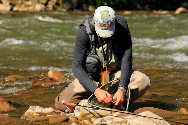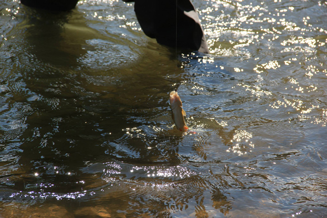 Можливо, я трохи не вгадав з окулярами – у синіх було зле, в коричневих ще гірше, а прості оптичні не давали мені можливості повноцінно оцінити глибину місця, куди я мав намір закидати. Таким чином довелося повністю виключити довгі закиди – мушки просто б не було видно. Відповідно, я зробив ставку на те, що побачив в попередні дні – «короткий сухарик». Знову ж таки не впевнений у цій теорії, але дуже легкий шнур і довга вудка давали непогану можливість акуратно провести-пострибати сухариком з тою швидкістю, яку я сам собі запланував і не залежати від течії. Поки я призвичаювався що до чого, як прийшов Дмитро Петруняк – він заміняв Женю в якості судді.