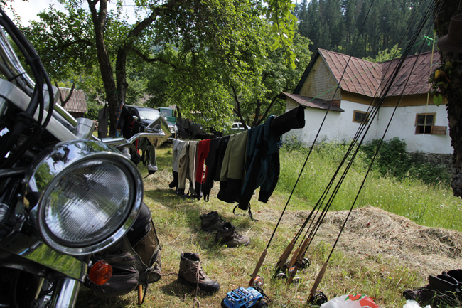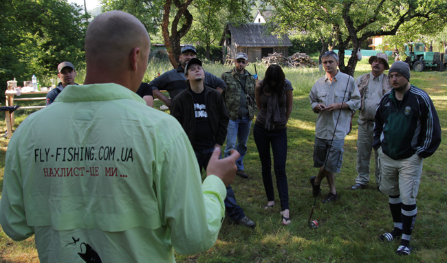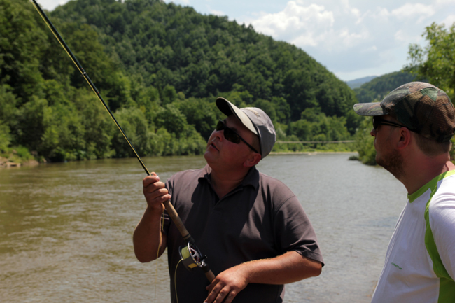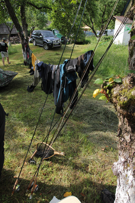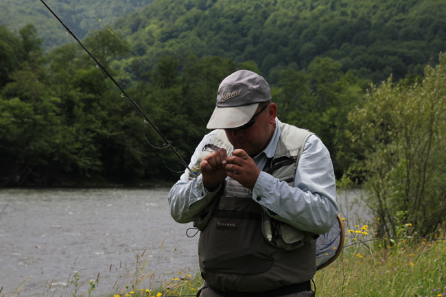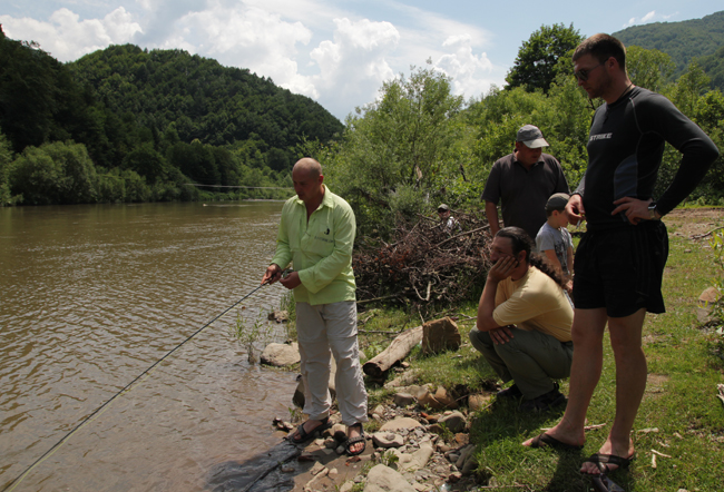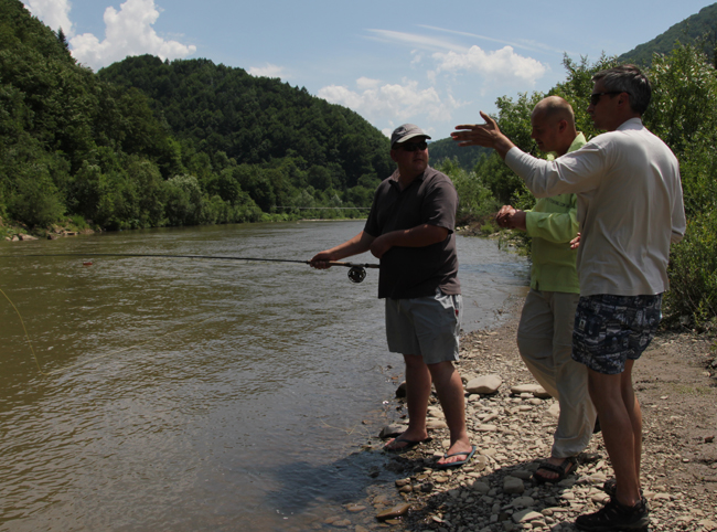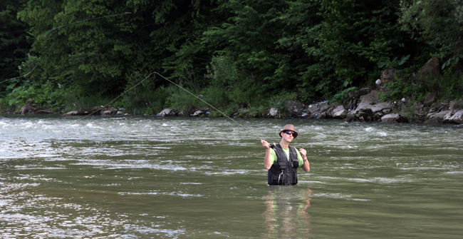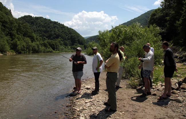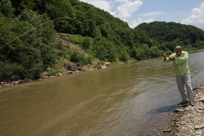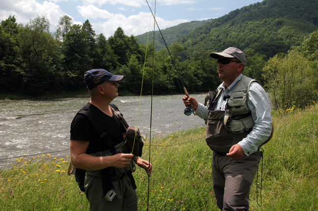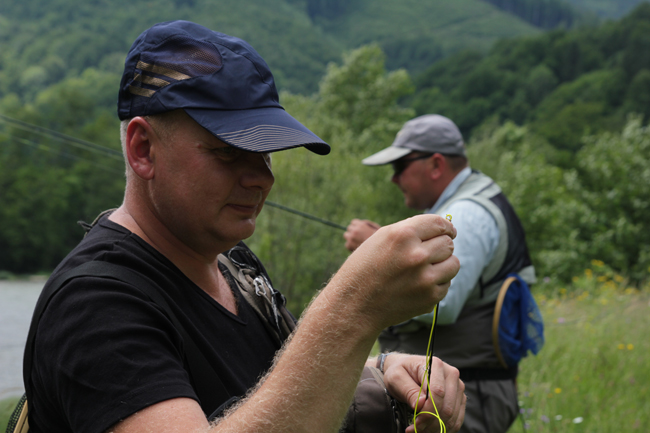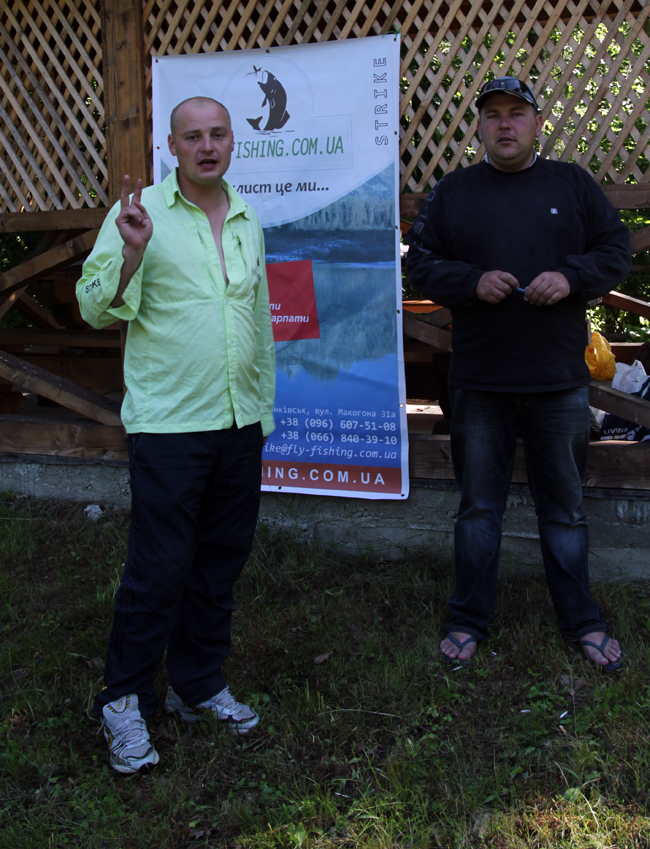 Отже, на територію лісництва ми з Юрою приїхали ще в середу, слідом за Степаном Чехом і його рідними. Якраз покосили траву, яка, мабуть, пахла, але через нежить я нічого не міг понюхати. До цього на Ріці я ловив один раз – в вівторок ввечері, біля Міжгір’я. Окрім бистрянки нічого не було, харіуса я взагалі не бачив. Коли приїхали міжгірські хлопці то запропонували нам показати майстер-клас. Ми сіли в авто і поїхали униз по течії, далеко за ті місця, де закінчуються пули. Іван (той самий, хто бачить крізь воду і впізнає харіуса в фейса) одразу ж стрибнув у воду і став посеред перекату. Ми з Юрою Жиденком, Стьопою Чехом і Юрою Щербатим почали переміщатися по ріці куди повільніше. Іван свиснув – є перший харіус. Звичайно, на суху. Власне, методика лову харіуса у виконанні Івана дуже відрізняється від того, як традиційно ловимо ми. Цей спосіб можна назвати «коротка суха», адже шнур і підлісок практично не лягають на воду. Мушка просто скаче по воді, не так імітуючи смачну поживу для риби, як роздразнює її. Таким чином Іван зловив п’ять пирів, Стьопа винімфував чотири, а ми всі несолоно хлебали. В мене взагалі нічого і ні на що не ловилося. Цікаво, що в коробці Івана було всього 14 сухих мушок, п’ять з яких за його словами «неробочі» – він міг їх комусь віддати. Коли ж Іван відкрив мій флайбокс, то досить швидко його закрив, мовляв, жодної робочої мухи. Ну і з чим я на Кубок приїхав?