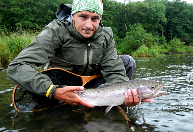 Біля 10 хвилин пізніше, і 50 метрів униз по ріці, я вже бачу, що це – райдужка. Сюрприз. Мені вдається завести її у підсак (як добре, що недавно придбав підходящого розміру у Степана – у мій «карпатський» L.L.Bean помістилась би хіба половина риби), я нарешті даю волю емоціям. Підходить Гануська, яка слідувала за мною з фотоапаратом, ми роздивляємось рибу, міряємо довжину. Цю рибу уже явно ловили. У неї голова в шрамах від жилки, одне око частково або повністю незряче. Довжина 55-56 см.