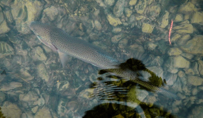 З сумом дивлюсь на зарослі хащами береги, і розумію, що вертатись доведеться по ріці, де швидка вода і жорсткі пасма подорослів сильно утруднюють рух проти течії. Щоб було веселіше, ставлю суху. Ловлю ще одного невеликого харіуса, але загалом риба кооперувати відмовляється. Повільно бреду вгору, шльопаючи мухою «на автоматі». В один з пропливів мухи бачу якийсь рух. Зупиняюсь, довго вдивляюсь у те місце і раптом око виокремлює посеред плям каменів і трави велику рибину, півметра, не менше. Завмираю і спостерігаю за нею. Це форель, вона повільно рухається вгору, якихось метрів 5 від мене, по дорозі щось вибираючи з трави. Акуратно пропоную їй суху поденку. Ноль. Іду за нею вверх, по дорозі міняю муху, знов з трудом знаходжу силует риби, пропоную, міняю, пропоную. Ноль. Пробую поставити легкі німфи. Нічого. Риба не боїться мене, але і на мухи уваги не звертає. При тому продовжує харчуватись. Отак, за рибою, і доходжу майже до машини, де й гублю її з виду нарешті. Привела мене додому :).