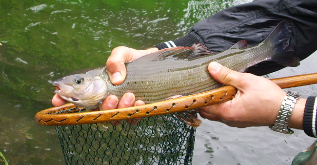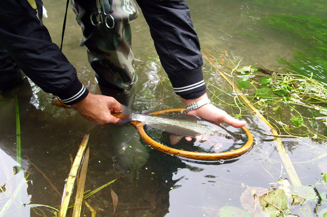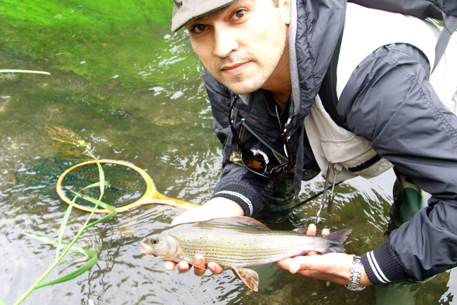 Зарядивши свой #3 Грэйс двумя нимфами, тихонечко спускаюсь в воду. Поле 10 минут вываживаю первого харька. Размер около 30 см, неплохое начало.