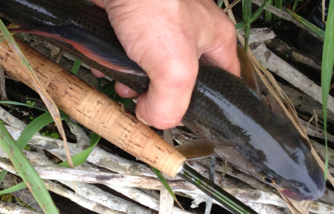 Вспоминая слова Алекса, перевязываюсь на #5, что б не мучать «среднюю рыбу» и попробовать мою новую лялю в действии. Пройдя выше, через минут 15, цепляю еще одного уже немного помельче, «среднего» хариуса на 42-43 см, уже не фоткая, выпускаю и любуюсь как он красиво уходит и пропадает в глубине, между растительностью на дне.