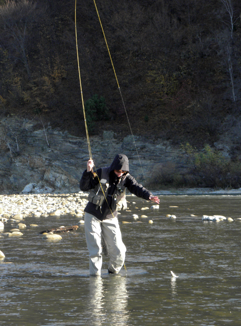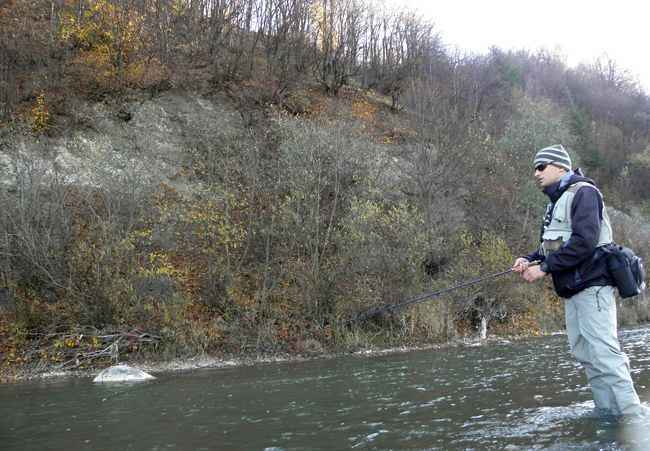 Для того, щоб ловити в таку погоду, на мою думку, треба мати довгу і швидку вудку, щоб хоч якось пробити вітер. Моя Кола CN цілком відповідає таким вимогам, але крім довжини і ладу довелося вигадувати, як закинути мухи і як їх проводити. Закидати я пробував максимально швидко і різко, виходило, правда, не завжди.