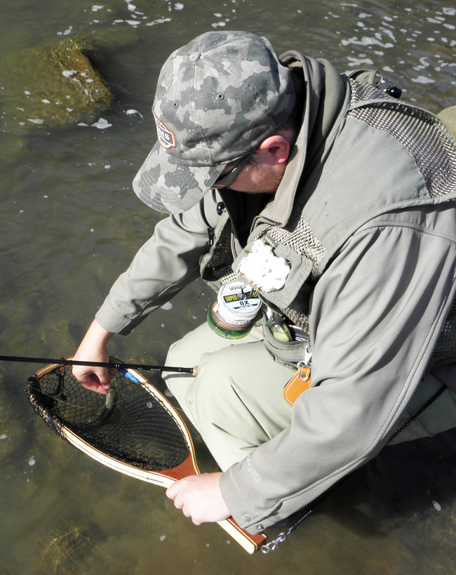 – Якщо є така можливість, то найкраще зняти гачок у воді, не торкаючись риби. Гачки без борідки дозволять це зробити дуже просто. Якщо риба глибше заковтнула мушку, то треба скористатися корнцангом – дуже корисний інструмент;