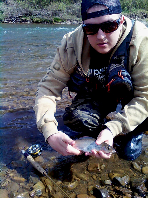 Наступним був наш улюблений перекат. Перше хороше місце і Вова тягне форель. Краса! Я стаю за перспективний камінь, проводка – гол! Перший пстружок-підкаменщик теж відмітився в моєму денному звіті успішності. Ще кілька проводок – знову форелька. Вони були невеликі) Місце, де Ростик минулого року витягнув пристойну форель, яку не зміг сфотографувати… Проводка – харитон! Цей був трошки більший, але худий, як топ модель. Напвено, нерест для нього уже пройшов успішно. Ще одна проводка – форель! На вигляд – 24.3см.