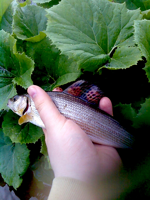 Маленьке відгалуження річки, глибина – 30 см. Вова схвильовано показує на цей струмок, а там 4 – 6 рибин швидко пливуть проти течії. Червоні плавники відразу видали підуству. Невеличкі, приблизно такі, як коні риби повернулися в глибші місця побачивши нас. Ще один перекат. Мій прогноз: “ми повинні тут ще по такому пстругу, десь по 500грам зловити”. Вова зловив. Але грам на 50-100 :). Ще одне моє улюблене місце потішило пристойним, потужним харіусом, який трошки заставив мене потрусити салом біжучи за ним по сильній течії… На цьому ми закінчили наш сьогоднішній похід. Перейшли річку, зайшли в магазин, в якому продавала дуже красива молода дівчинка. На правах неодруженого мужчини я досить приємно з нею поспілкувався, і 4 км сільською дорогою, в оточенні бендерівських будинків ми йшли під проливним дощем додому. Романтична професія риболов….