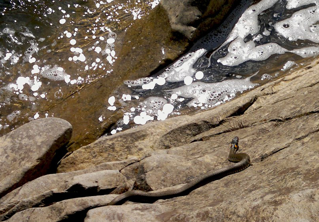 Через 200 метрів нас зустрів невеликий вуж. Він дуже сильно на нас шипів і скручувався, ніби готуючись до атаки. Я сказав йому: “Іди спати: утро вєчєра утрєнєє!”. Ще зовсім трошки і ми у воді. Німфа… Нижня – Несторова, верхня – чорна з червоною точкою, про яку Ростик писав не так давно. Дуже давно ми з Вовою плануєм зняти фільм під назвою “Безрибна ловля на Свічі”, а ця ділянка якнайкраще вписалась би в сюжет даного відеоряду… Маленький хлопчик з дівчинкою плавають на великій надувній камері. Сплав по гірській річці розбавлений капелькою романтики порадував душу жирного музиканта…