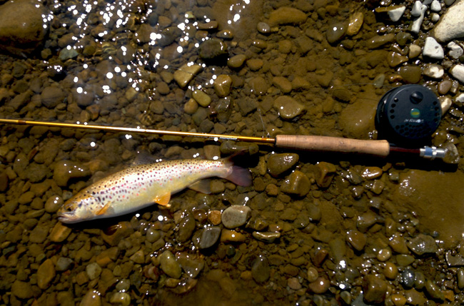 Тягну форелика до берега: гарний, жовтий, жирний. Вова фоткає мене на Нокіа. Шматка жаберної кришки в нього не було. Зовсім малого куска. Видно, що рана уже зажила. Часто зустрічаю таких риб у нас. «Кришка пішла на озброєння» – сказав Вова. Довго ми не фотографували рибу, бо я не знаю в якому вона зараз стані. Акуратно відпустив. Спрацювала нижня Несторова німфа на 12-му номері. Хвіст у неї з коричневого півня, тіло з коричневого спектрадабінгу і темний торакс. Нічого особливого, але працює, як годинник. Трохи нижче цього місця, в жовтні, я зловив форель, яку потім сфотографував у воді.