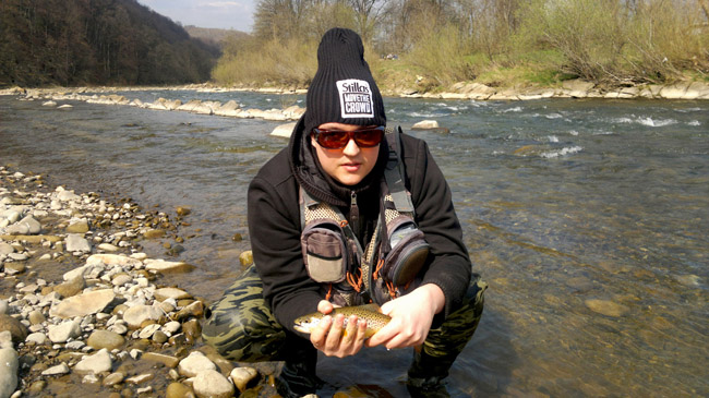 Проходим ще 100 метрів і Вова починає тягнути не менш потужну форель! Не довго музика звучала, недовго фраєр танцював. Через кілька метрів риба сходить. В тому місці завжди важко виважити рибу. Літом там гідно ловиться харіус. Нижче на порогах я побачив перспективне місце. Кілька проводок – нуль. Великий перекат, обмежений великим каменем. Ще одна проводка, удар – і чергове фото з фореллю летить на мою стіну вконтакті. Після цього з того самого місця почав тягнути форель, розміром 6-8 см, яка зірвалась на відстані 15 см від берега…