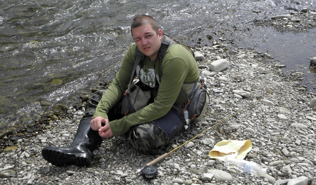 Вода ідеально чиста, рівень катастрофічно низький. Розкладаєм вудочки, травим анекдоти з іншим товаришом, який романтично сидів на березі річки з дівчиною, сміючись з того, шо в мене дуже сексуальні чоботи. Французька німфа: нижня з золотою головою 3.5мм на 12-му номері, нижня – 16 номер, голова – 2.8мм. Потрохи починаємо свій шлях вниз по річці. Глухо…