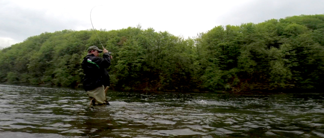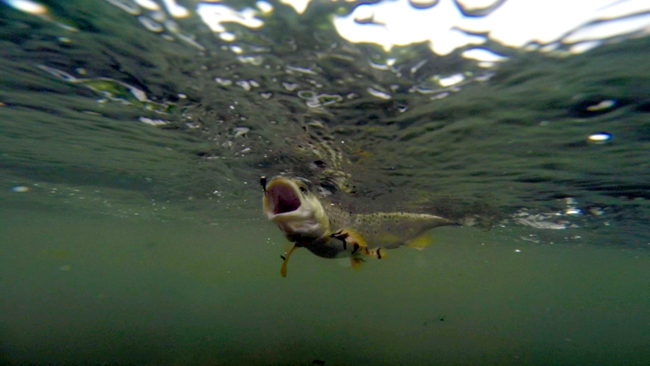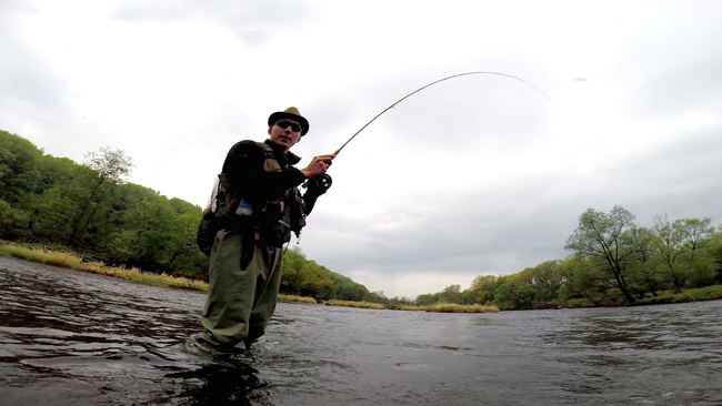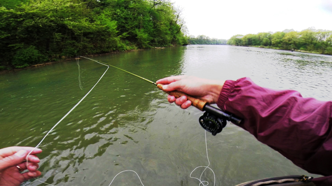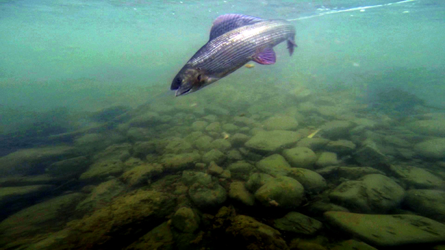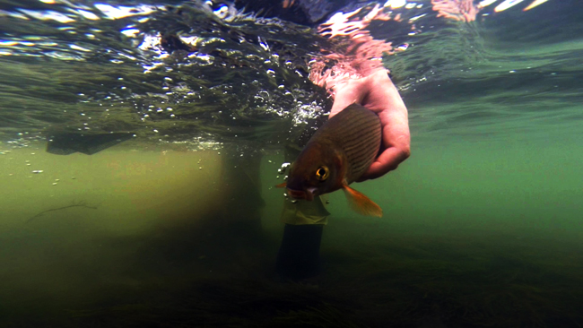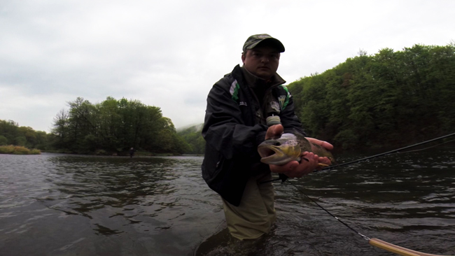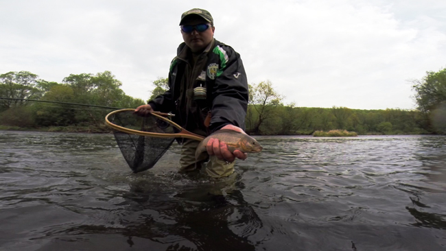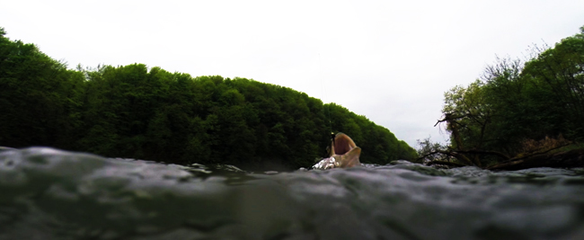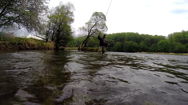 Що декілька хвилин міняємо мушки, форелі і харіуси раз за разом проходять дорогу мушка-підсак-річка. Кожна сіро-коричнева муха невеликого розміру працювала. Мене гукає Ростик, вудка зігнута бубликом, фрикціон визжить, я поспіхом включаю камеру і несусь до нього. Трофейний харіус явно за 50 сантиметрів сходить… нестримний потік ненормативної лексики з обох сторін. Але що поробиш. В Ростика 9 разів підряд рибина виходить за мухою, але ніяк не засікається, аж смішно стає.