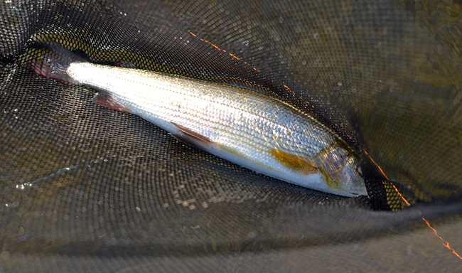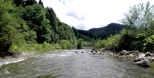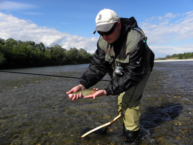 На такому пулі нема сенсу ховатися від риби. По-перше, кришталево-чиста вода, по-друге, жодного кущика чи великого каменя. Взагалі, я не люблю ховатися від риби, підкрадатися до неї на колінах тощо. Це створює лише дискомфорт і практично не впливає на активність харіуса. Хоча, на думку Степана Чеха, харіус ловиться краще, коли нахлистовик маскується. Як би там не було, я випростався з самого верху свого пулу. Націлився на мілину на початку зливу. Володя махнув рукою, я закинув німфи в перспективну зону. За дві секунди відбулося клювання і я завів до підсака першого харіуса, сантиметрів на 27. Небезпечна риба – може зійти перед самим підаком, необхідно шукати щось скромніше. Але менші пирики не ловилися. За перші десять хвилин у мене було вже три крупні харіуси, ще два зійшли біля самого підсака. Потрібно було змінювати місце, переходити на мілину і сподіватися, що я не помилився з дислокацією дрібноти.