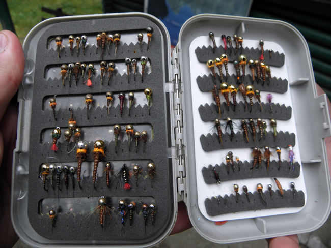 Словом, на око, пул видавався мені доволі перспективним, залишилося дочекатися мого арбітра. Володя прийшов якраз тоді, коли я розкладав вудки. Німфову трійку оснастив традиційно – внизу «шоколадка» з мідним вольфрамом 3,5 мм, вверху довга «шоколадка» чорного кольору із 2-міліметровою срібною латунною голівкою. Підвісна муха – волохатий коричневий розвідник, який при бажанні стає то сухою, то мокрою. Усе готове, можна починати.