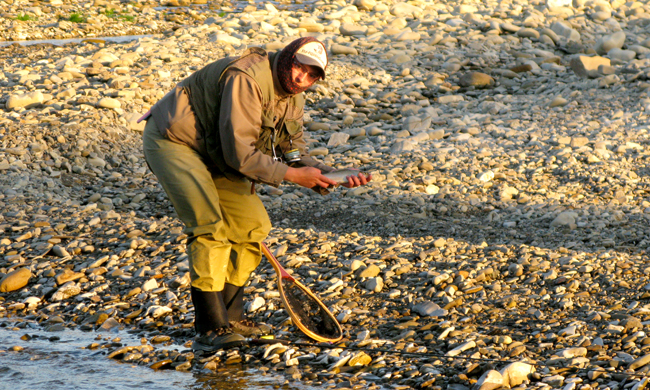 Перші проводки були надзвичайно важкими, але дали зрозуміти, що харіус готовий до сніданку. З одного місця вдалося зловити двох красенів на шоколадки із золотими латунними голівками 2-2,5 мм на гачках №18. А от половити на більш перспективних місцях я не зміг, бо вейдерси трохи барахлили і десь в районі талії підтікали. Дальні закиди французом під час вітру – ледь не божевілля, але одну рибу це мені таки принесло, щоправда, дорогою до підсака вона зійшла. Міша тим часом ловив набагато більшими мухами і користі це не приносило.