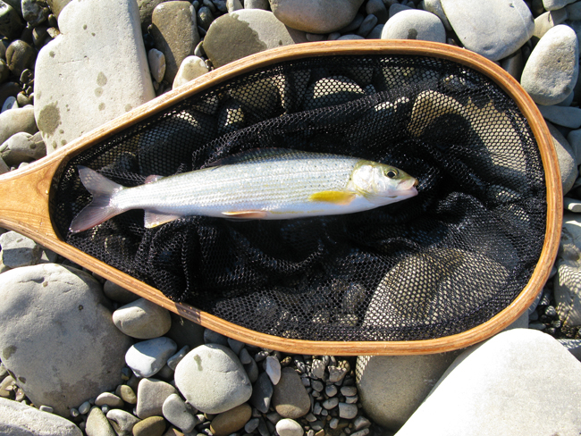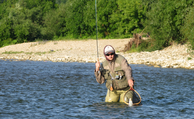А от далі було глухо, навіть у перспективних місцях. Повернувшись на місце, звідки ми починали, я упіймав ще одного харіуса, а Міша загубив підсак. По собі знаю, який це облом – торік в листопаді посіяв його на Сяні з самого ранку… Міша спробував пошукати його, але течія свою справу зробила. Якщо хто знайде – свистіть. Це підсак виробництва Степана Чеха, його ні з чим не сплутаєш.