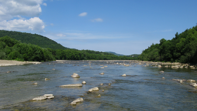 Відійшовши трохи далі я виманив чотирьох харіусів і на «розвідника», і на крихітні німфи від Богдана Цебрика. Можна було ловити й надалі, але під кущами та деревами я помітив активні рухи, характерні для голавля. Чому б не спробувати половити його на стрімери та жуки? Довелося, правда, повертатися до авто і змінювати вудки, переходити через бурхливий потік. Буквально за кілька хвилин вода в ріці піднялася щонайменше удвічі, затопивши береги із побілілими від спеки каменями.