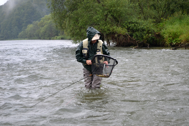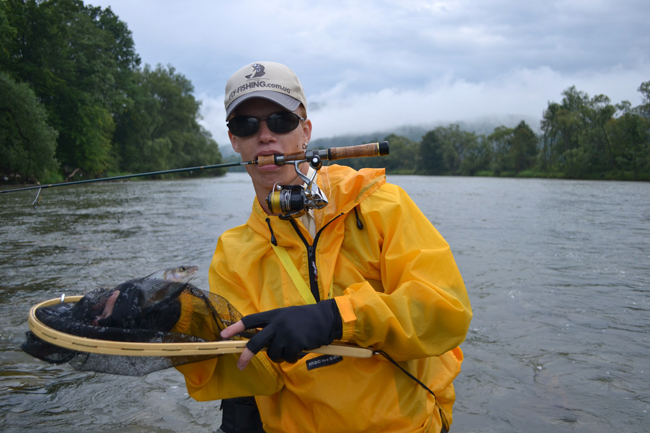 Найбільш ефективні німфи – золота, срібна голівки; тіло шоколад або рижий; торакс оранжевий, коричневий; чорний даббінг. Розміри гачків 16, 18. До обіду, після 60 форелей банально втратився лік. Харіусів переловилося більше 20, троє з них були біля 30 см. Декілька монстро-пстронгів порвали снасть… Як сказав колись один мухар – «шаленьство». Після обіду сирість давала про себе знати, стало холодно, враховуючи те що вода в Сяні за температурою однакова як і літом так зимою.