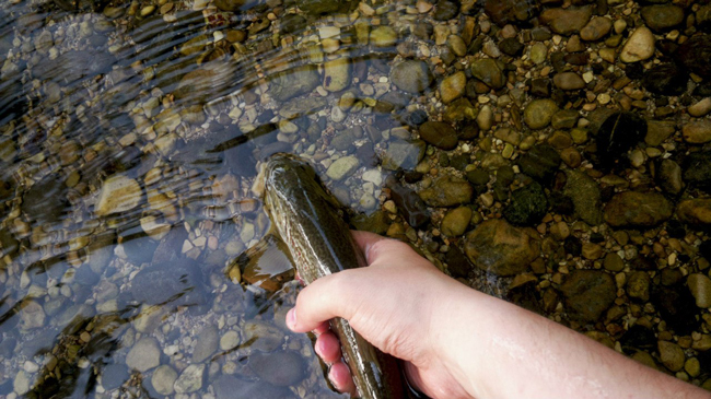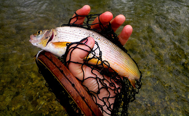 Є там одна цікава місцина, досвід ловлі на якій полегшив мої страждання на рідній Свічі у Вигоді. Яма з швидкою течією з одного боку. Я зайшов, по класіці жанра, зі сторони ями і тихої води, риба не ловилася. Проводки робив спочатку на тихішій воді, а потім на границі течії з тихою. Я поставив досить потужну Несторову німфу зв’зану на гачку Tiemco 200R 14го номеру, підвантажену свинцем в тілі і озброєну вольфрамовою головою розміром 4.5мм. Також зробив довший поводок (ловив французьким методом). Німфа відразу ж пробила глубину і я відчув гідний удар. Перший раз в житті я зловив великого харіуса. Він не був трофейним, але мав в собі більше 40 сантиметрів. Ми познайомилися. Його звали Валєра, сказав, шо він – кримінальний авторитет і коли харчується, то на ямі більше нікого немає і порадив мені піднятися вище на перекат. На цьому я його відпустив, однак не зафоткав, бо він пригрозив мені жорсткою розплатою. Пізніше на цьому ж місці я зловив і першу мармурову форель. На наступній рибалці там само зловився ше один харіус. Він здався крупнішим, ніж був насправді, я сказав: «Валєра, ти?». Він відповів, шо його звати Вітя, сказав, шо Валєри десь немає, і мав в собі сантиметрів так 35-36. По карпатських мірках це дуже крута риба, тому я залишився задоволеним.