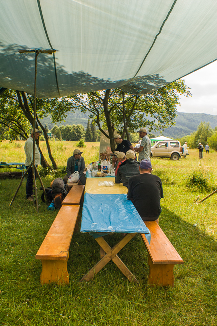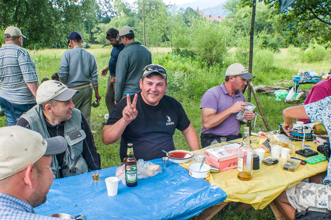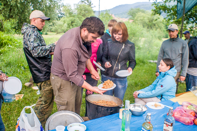 Коли вже плелися останні мушки, Діма Поплавок зі своїм товаришем Льошою якраз перевіряли на предмет готовності те, що варилося у здоровенному казані. І якими б не були «смачними» фірмові німфи від Івана Повхана і Степана Чеха, учасники семінару щораз частіше поглядали в бік ще смачнішого варива. То був плов. І не просто якийсь там плов, а справжній, запашний, духмяний і неймовірно смачний (жаль, не скуштував, але вірю усім на слово). До плову як в суху землю пішли й п’ять літрів домашньої самогонки від Дмитра Петруняка. Ще одне, за чим можна зітхнувши посумувати. Забава тривала до другої ночі – бракувало лише Ореста Дейнеки з його гітарою, зеленим листям і білими каштанами.