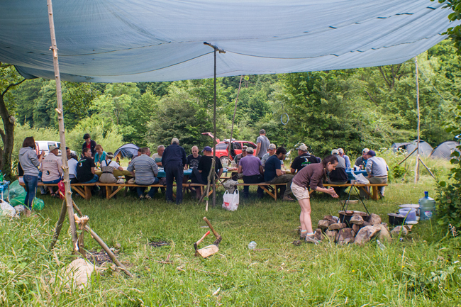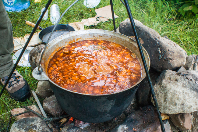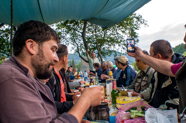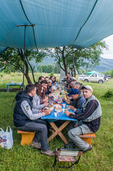Коли ж субота добігала фінішу, зморений народ намагався занюхати: що ж буде на вечерю. Цього разу Діма з Льошою вирішили побалувати компанію екзотичною шурпою, від якої в усіх аж слинка котилася. Оскільки благородну «петруняківку» вже було спожито, на столі з’явилися різного роду буржуйські трунки типу віскі. А ще, кажуть, житомирське сало було і таке, що забути його смак ніхто не зможе, навіть якби захотів. Компанія сиділа за великими столами під тентом, який таки пригодився – уночі почалася хоч і не довга, але злива, проте заглушити спів таки не змогла.