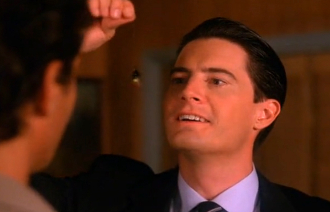 6Принаймні, перший постійно ловить рибу (іноді випадково вона потрапляє в термос з кавою), а другий в’яже щось схоже на мокру «осу» і дарує її Дейлу Куперу.