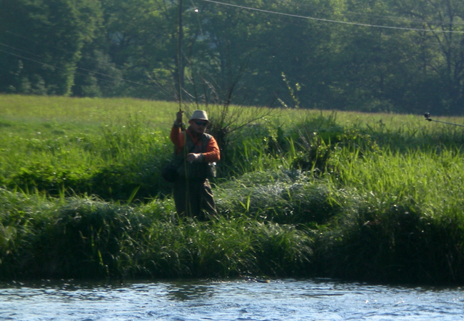 По березі Сяну, паралельно до нас, стрибав молодий олень, який за мить зник у кущах. Приємно світило сонце і взагалі, природа та погода зробили усе, аби нам було добре. Перед виїздом ми заїхали на електровню, звідки й починається OS San. Дві турбіни пускали у річку бурхливі потоки. При цьому, так було й минулого тижня, тож мухарям слід бути дуже обережними на такій воді. Уже в самому Лєско ми купили необхідні продукти, трохи пива і рушили на захід. На Дунаєц.