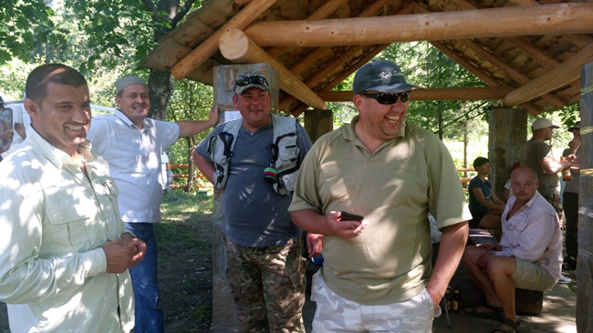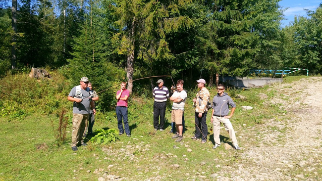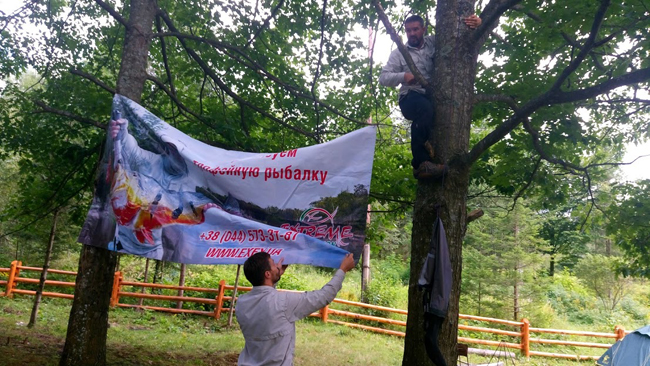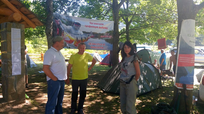 За ними підтягнувся Дмитро Петруняк з бутльом домашньої малинівки. Мало-помало табір почав розростатися – хтось розставляв намети, хтось накривав на стіл, хтось вішав банери, хтось уже розмахував вудками та ділився мухами.