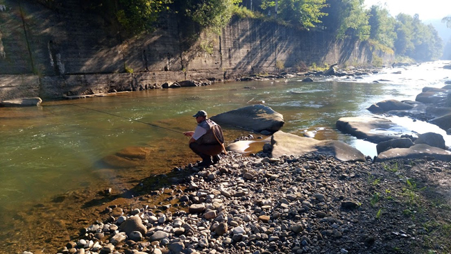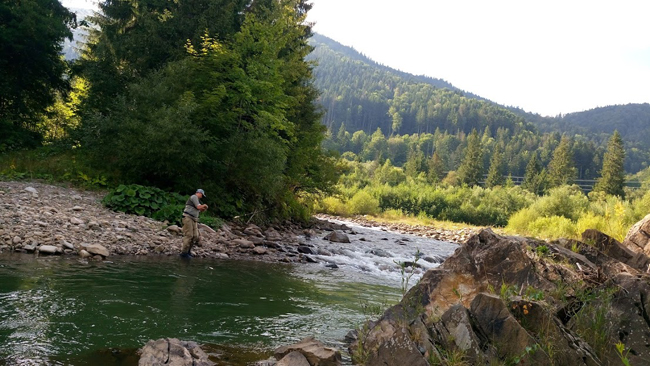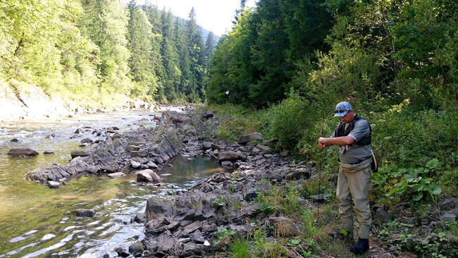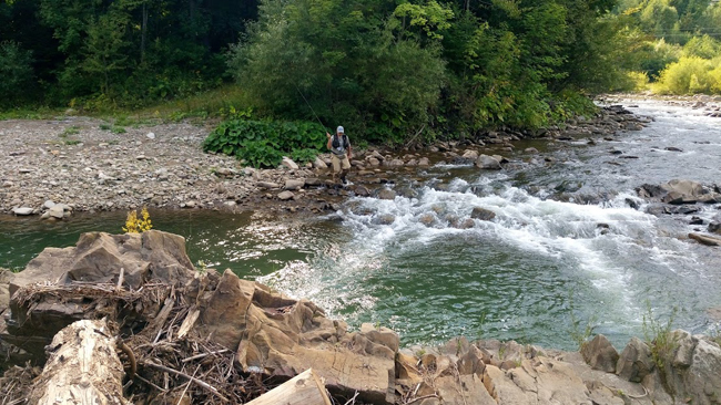 0-02-01-24cc62ad6a882158a46df1d95e10f1a3154eeb26a9641aaa36ece79debf8bba5_fullЗалишається ще одна яма і описана вище цікава місцина. На глибині порожньо, а от на бистрині отримую очікуване клювання. Після кількох проводок з води вилітає маленька форелька, яку я ловлю підсаком просто в повітрі. Біжу до судді, показую рибу, швиденько її відпускаю і продовжую прочісувати річку. Спрацював старезний фезентейл із помаранчевим тораксом. Ще одне клювання, риба в повітрі, але цього разу вона падає просто перед ногами. Халепа.