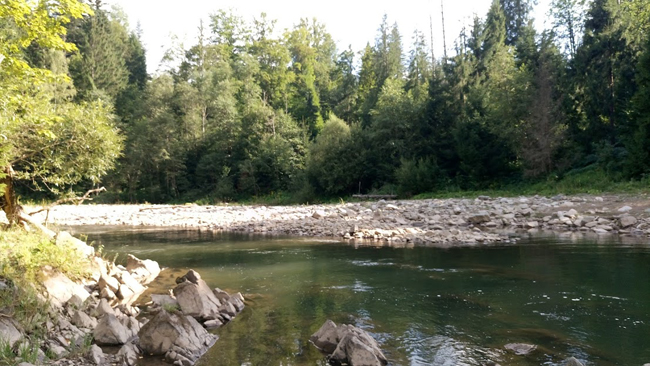 DSC_0183Саме місце було мені доволі знайоме, я вже тут одного разу рибалив, коли приїжджав на Свічу разом з Арсеном, Мішою і тим же Сашком. На головній купальній ямі за шість проводок зловив три прекрасні риби – два крупних харіуси і одну форель, трішки меншу. Зараз же ця яма не виглядала такою привабливою.