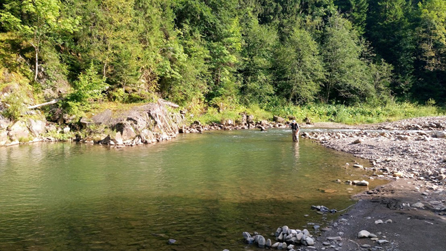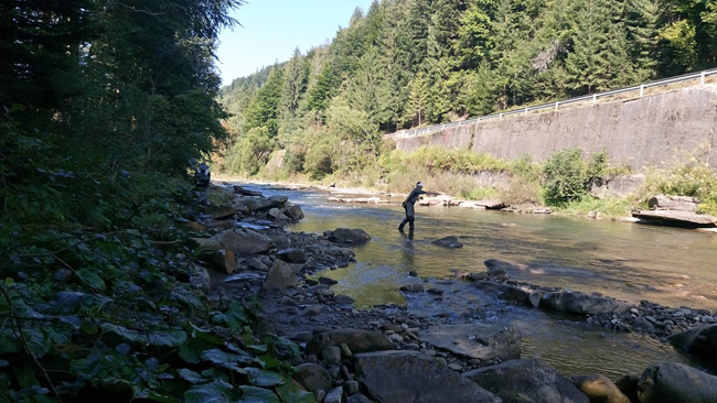 DSC_005319-ий пул я забракував ще під час розмітки, якою займалися Віталік Смігановський і Руслан Пугач. Я жодним чином не втручався у неї, але зверху бачив, що пул слабий. Тим не менше, на ньому доволі успішно відловилися «шулявські», які упіймали і харіусів, і пстругів, і палій. Знизу пул виглядав не таким вже й поганим; за приблизними оцінками там було з десяток перспективних точок.