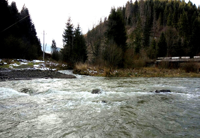 Далі ми опинилися в ситуації, коли річку-переплюйку перейти було просто не реально. Скажена течія запросто змила б нас куди подалі. Тому довелося чимало обходити, але навіть це не допомогло – ріка все ще була брудна і висока. Місцевий рибалка закинув дві донки на хробака і «рачка», ми полоскали найцікавіші ділянки німфами. Щось схоже на клювання я отримав, однак не більше.