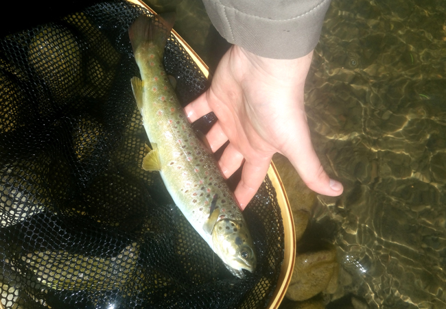 Швидка течія змусила трохи корегувати розмір мух. Дуже вже кортіло поставити щось значно більше за 4 мм, але щоб уникнути спокуси, коробка з великим вольфрамом залишилася в машині. Ставлю на низ найбільшу з дозволених головок, що прикрашає основну, як на мене, робочу муху на цей період. Зверху – імітація волохокрильця, мабуть, улюблений корм тутешньої риби. Перші проводки дають зрозуміти, що цього замало, аби пробити яму, тому доводиться імпровізувати. Кілька маніпуляцій із новим підліском, індикатор занурюється, кінчик вудки опускається ледь до самої води і нарешті відчувається такий приємний удар. Форель у яскравих, темно-лимонних барвах, після нетривалої боротьби випливає, опиняється в підсаку і дуже швидко зникає в глибині. Робоча муха дала результат практично одразу. За нею слідує менша форелька.