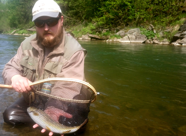 Уся риба дуже активна, бадьоро опирається і швидко відходить, якщо, звісно, не мацати її. Повертаємося до першої ями. Одразу ж ловлю одну форель – знову на робочу муху, а після чергової спроби пробити дно, тіло пробивають дрожаки. Таку нереально-приємну важкість я відчував хіба за кордоном. Вудка скрутилася в дугу, риба впевненими ривками намагається врятуватися і не виходить на поверхню. Дрижчить фрикціон, дзвенить підлісок. Володя-старший, який розташувався нижче, відклав вудку і зайняв бойову позицію з підсаком. Перші спроби були невдалими, але зрештою, фантастичної краси пструг опинився у рятівних тенетах.