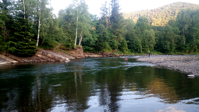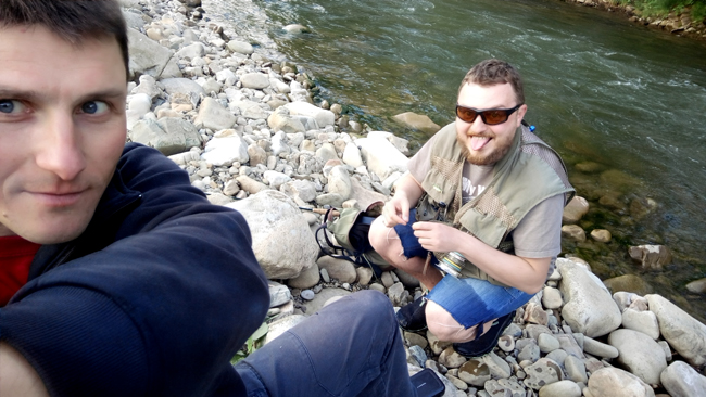 Тим часом бесідка окупувалася закарпатським легіоном. На столі міцне домашнє вино, не хитра закуска, а ще атмосфера доброго настрою. У цьому місці всі стають друзями, навіть якщо бачаться вперше. У мене дилема: половити рибу чи провести час за столом. Вирішую, що можна поєднати приємне з корисним, тому швидко взуваю амфібії, хапаю вудку, жилет, коробку з мухами і гайда на домашній пул.