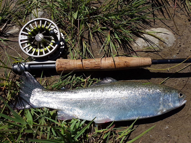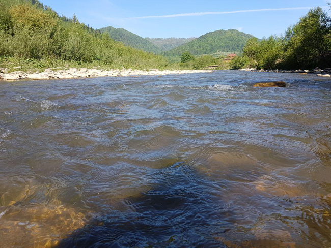 Трохи перепочив, продовжую рух угору. Риба відгукується не скрізь, є певний процент слабких дибань без результату. Але в підсумку маю ще три харіуси, два цілком залікові – 25-27 см. Взяли на останній ямці, де в неї впадає мутна притока – ось і причина легкої “сивини” основної ріки. Рух униз особливих дивидендів не приніс, доки не дійшов до найглибшої ями. І в її найглибшому місці, на найгрубіший мій ред таг отримую такий впевнений, солідний удар. Далі – справа техніки, поволі викачую з ями пристойну райдужку, яка примудряється зробити дві видовищні “свічки”, і не зійти при цьому. Красуня має під 30 см, ну як таку не відпустити?!